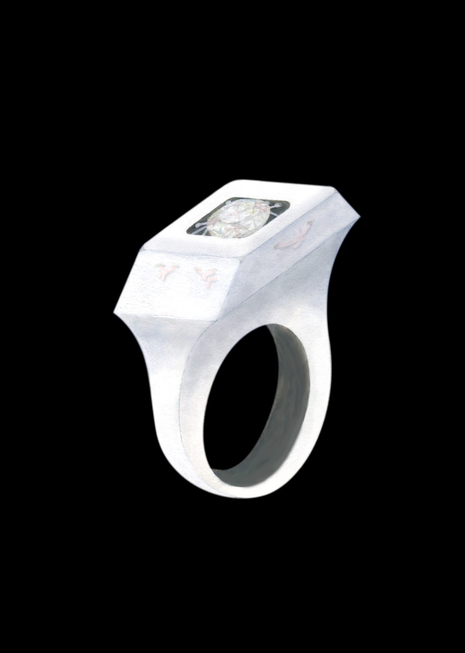 モチーフは電球です。電球で閃きを表し、その中にアンカットダイヤモンドを留めることで、その閃きで何事にも屈さずに挑む意志の強さを表現しています。これから困難に向かう人に向けて考案しました。